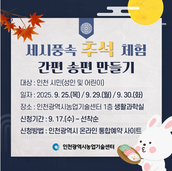 [무한뉴스=정승훈 기자] 인천광역시 농업기술센터는 다가오는 명절 한가위를 맞아 시민들이 전통문화를 직접 체험하며 추석의 의미와 농업·농촌의 가치를 되새길 수 있도록 ‘추석 체험 프로그램’을 운영한다고 밝혔다.