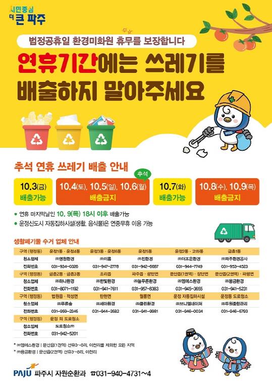 | ▲ 파주시, 추석 연휴 기간 쓰레기 배출은 잠시 멈춰주세요 |