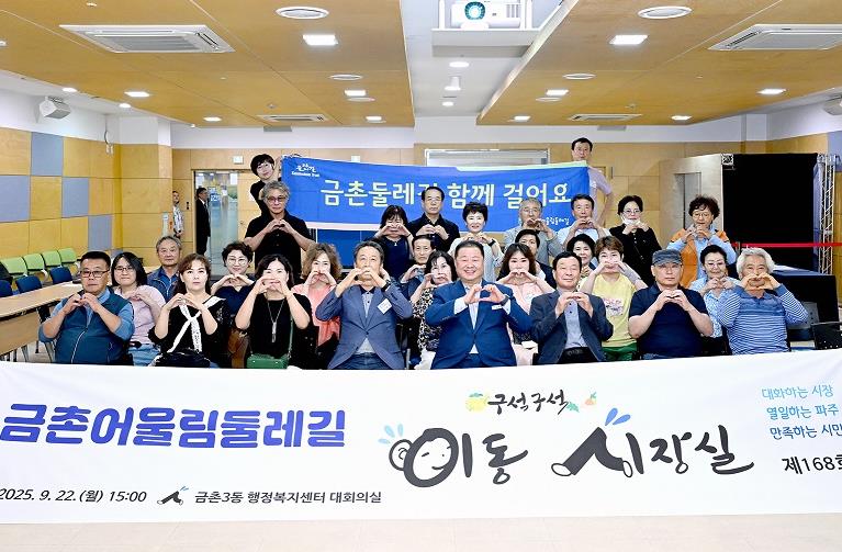이번 금촌어울림둘레길 이동시장실에서는 ▲금촌둘레길 구간 연결성 강화 ▲안전한 보행도로 확보 ▲금촌둘레길 가이드북 제작 및 배포 ▲역사와 의미를 담은 안내판 등 설치 등 금촌어울림둘레길과 마을 현안 사항들에 대해서 다양한 의견을 나누었다.