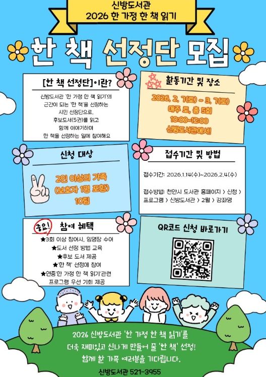 [무한뉴스=정민정 기자] 천안시 신방도서관은 ‘한 책 선정단’ 참여 가족을 모집한다고 20일 밝혔다.