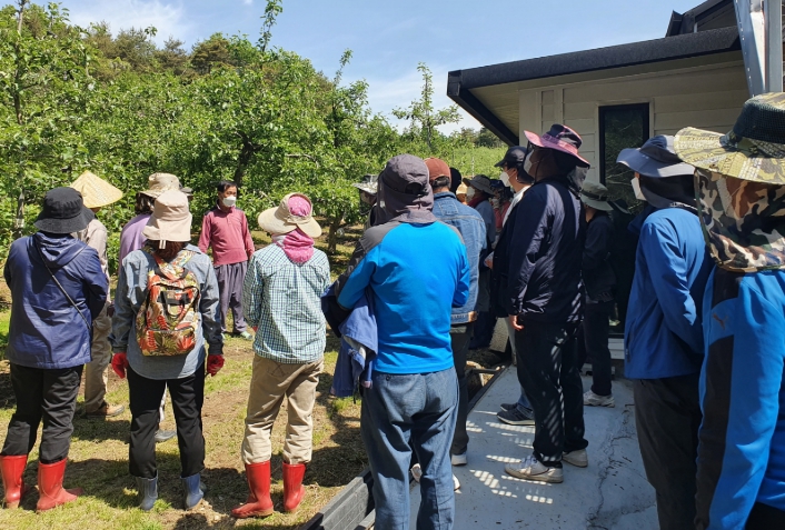 | ▲ 예비 귀농귀촌인들이 과수농가를 방문해 현장 교육을 받고 있다. |