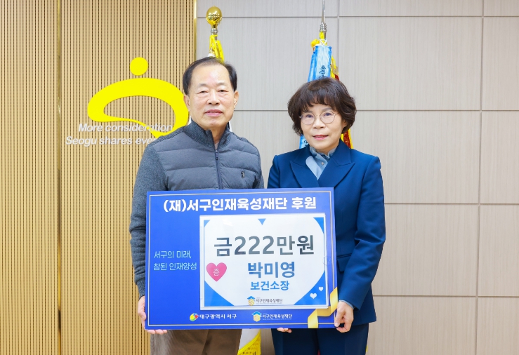 [무한뉴스=최진수 기자] 대구 서구청은 보건소 박미영 보건소장이 퇴임을 앞두고 지역 인재 육성을 위해 서구 인재육성재단에 222만 원을 기탁했다고 밝혔다.