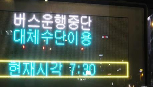 버스정류소 정보안내단말기(BIT) 4,500대, 도로전광표지(VMS) 서울 전역 315개소·시내간선도로 240개소에 버스 파업 알림 및 지하철 이용 당부, 가로변 버스전용차로 임시해제 등 관련 내용을 안내하고 있다.