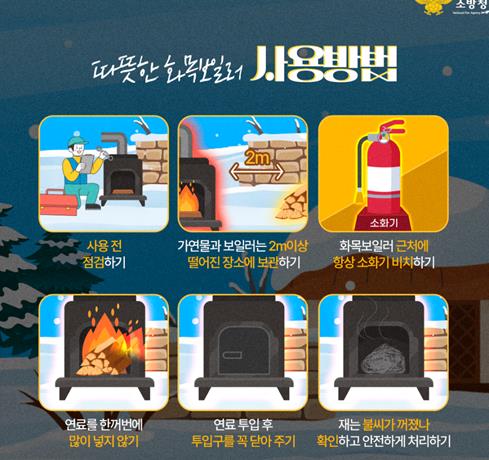 서산소방서는 화재 예방을 위해 ▲보일러 주변 2m 이내 가연물 치우기 ▲화목보일러 주변 소화기 비치 ▲연료 과다 투입 주의 ▲연료 투입 후 투입구 꼭 닫기 ▲사용 전·후 점검 철저 등 안전수칙 준수를 강조했다.