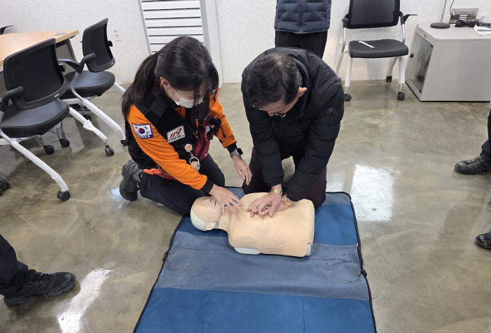 | ▲ 창녕정기시장 상인회에서 소방서로부터 전통시장 안전점검과 병행한 심폐소생술 교육을 받고 있다. |