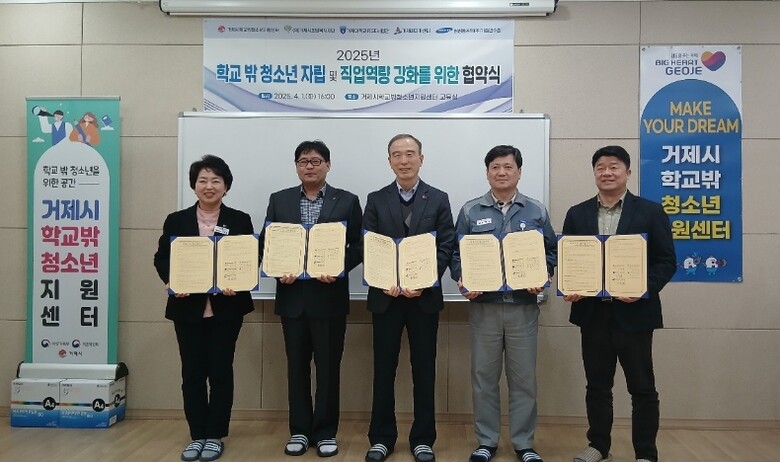 [무한뉴스=최진수 기자] 거제시학교밖청소년지원센터는 지난 1일 학교밖청소년지원센터 교육실에서 (재)거제시희망복지재단,거제대학교 RISE사업단, 삼성중공업(주) 기술연수원, 거제시청소년수련관 거제메이커센터와 ‘2025년 학교 밖 청소년 자립 및 직업역량 강화를 위한 업무협약’을 체결했다고 밝혔다.