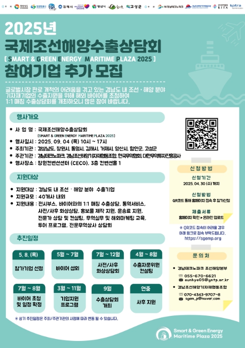 [무한뉴스=최진수 기자] 경상남도는 신규 참가기업 모집 확대 등 충분한 안내와 참여 독려를 위해 ‘2025 국제조선해양수출상담회’에 참가할 기업을 추가 모집한다.