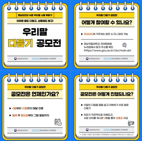 우리말 다듬기 공모전은 매달 둘째 주 월요일부터 그달 말일까지 진행되며, 경상남도민이라면 누구나 참가할 수 있다. 또한 ‘이달의 다듬을 말’은 경상국립대학교 국어문화원 누리집에서 확인할 수 있으며, 다듬은 말 제출은 네이버폼으로 하면 된다.