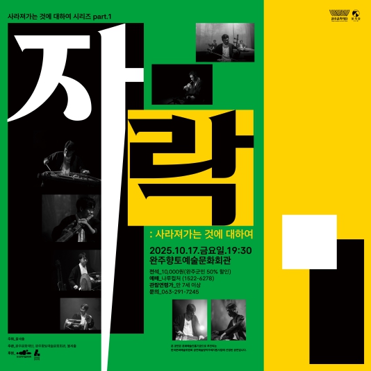 [무한뉴스=정민정 기자] 전북 완주군에 깊어가는 가을밤, 사라져가는 토속 민요의 숨결을 현대적인 감각으로 재조명하고 재해석한 특별한 국악 공연이 펼쳐진다. 완주문화재단은 오는 10월 17일, 완주향토예술문화회관에서 국악앙상블 불세출의 '자락: 사라져가는 것에 대하여' 공연을 개최한다