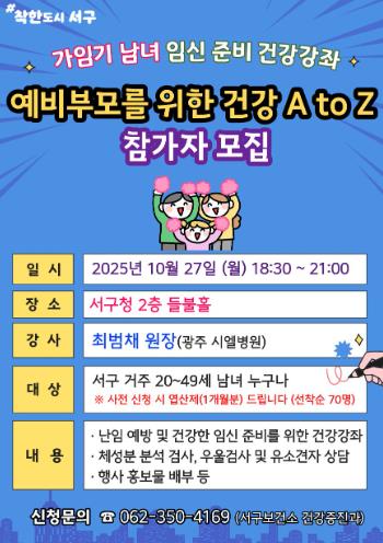 서구는 오는 27일 서구청 들불홀에서 난임치료 전문가를 초청해 ‘예비부모를 위한 건강 A to Z’ 건강강좌를 운영한다.