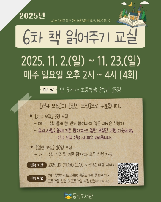 [무한뉴스=정민정 기자] 제주도교육청 동녘도서관은 11월 2일부터 23일까지 평생교육실에서 ‘2025년 제6차 책 읽어주기 교실’을 운영한다.