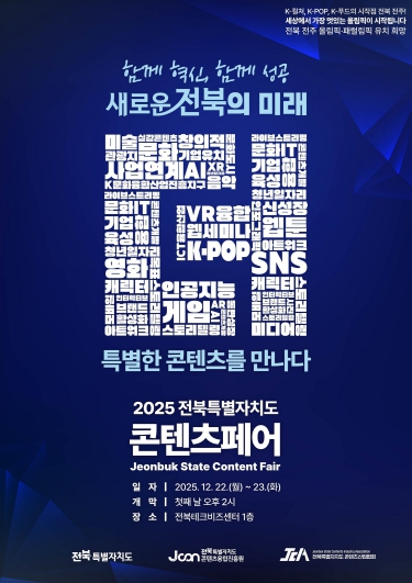 [무한뉴스=정민정 기자] (재)전북특별자치도 콘텐츠융합진흥원과 전북특별자치도 콘텐츠산업협회는 ‘2025 전북특별자치도 콘텐츠페어’를 오는 12월 22일 오후 2시, 전북테크비즈센터에서 공동 주관으로 개최한다고 밝혔다.