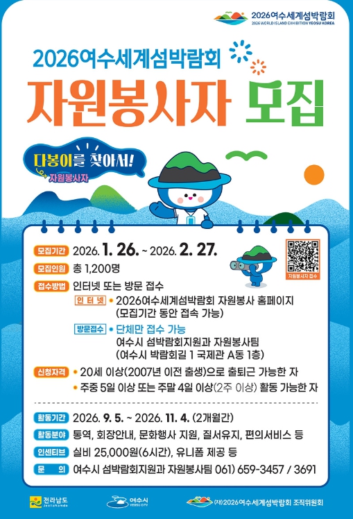 [무한뉴스=정민정 기자] 여수시는 2026여수세계섬박람회를 함께 이끌어갈 자원봉사자 “다봉이” 1,200여 명을 오는 1월 26일부터 2월 27일까지 한 달간 모집할 예정이다.