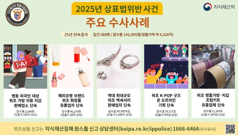 [무한뉴스=양현명 기자] 지식재산처는 지난해 상표권 침해와 위조상품 유통에 대한 전방위적인 단속을 통해, 상표권 침해사범 388명을 형사입건하고, 위조상품 약 143천여 점(정품가액 4,326억원 상당)을 압수했다고 밝혔다.