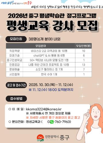 [무한뉴스=정승훈 기자] 인천시 중구는 오는 2026년 한 해 동안 중구 평생학습관에서 정규 프로그램을 담당할 전문성과 열정을 갖춘 전문 강사 38명을 공개 모집한다고 31일 밝혔다.