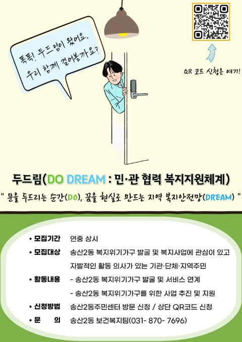 참여를 희망하는 기관‧단체‧지역 주민은 ‘두드림(DO DREAM) 모집’ 안내문을 통해 송산2동 주민센터에 문의하거나 QR코드를 통해 신청서를 제출하면 된다. 모집은 연중 상시 진행되며, 세부 사항은 송산2동 보건복지팀(031-870-7696)으로 문의하면 안내받을 수 있다.