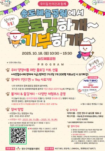 [무한뉴스=정승훈 기자] 연수구자원봉사센터는 오는 18일 송도혜윰공원에서 반려견과 함께하는 환경 기부 캠페인 ‘플로깅하개~ 기부하개~’를 개최한다.