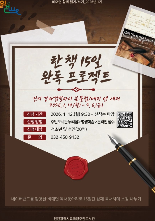 [무한뉴스=정승훈 기자] 인천광역시교육청주안도서관은 청소년과 성인을 대상으로 2026년 비대면 함께 읽기·쓰기'한 책 15일 완독 프로젝트'를 운영한다.