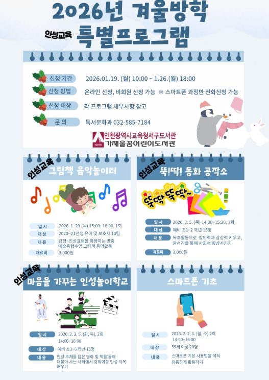 [무한뉴스=정승훈 기자] 인천광역시교육청서구도서관은 ‘2026년 겨울방학 특별프로그램’ 학습자를 19일 오전 10시부터 선착순으로 모집한다.