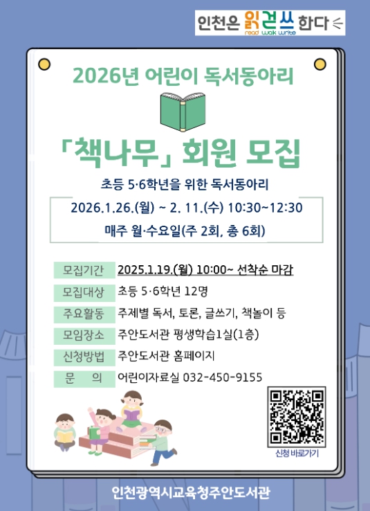 [무한뉴스=정승훈 기자] 인천광역시교육청주안도서관은 예비 초등 5·6학년 학생을 대상으로 하는 독서동아리 '책나무' 회원을 모집한다.