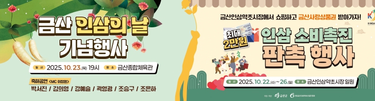 군 관계자는 “이번 행사를 통해 금산 인삼의 우수성을 널리 알리고 지역 경제 활성화에도 기여할 수 있기를 기대한다”며 “신나는 공연과 소비촉진 행사가 준비된 만큼 많은 관심과 참여를 부탁드린다”고 말했다.