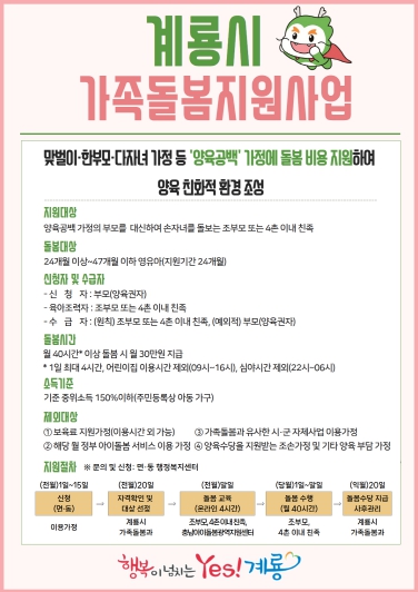 [무한뉴스=정민정 기자] 계룡시는 조부모 등 4촌 이내 친인척이 부모를 대신해 2~3세 영유아를 월 40시간 이상 돌봄을 제공할 경우 아이 1명당 월 30만원의 가족돌봄수당을 지급하는 ‘계룡시 가족돌봄지원 사업’을 11월 본격 시행한다고 밝혔다.