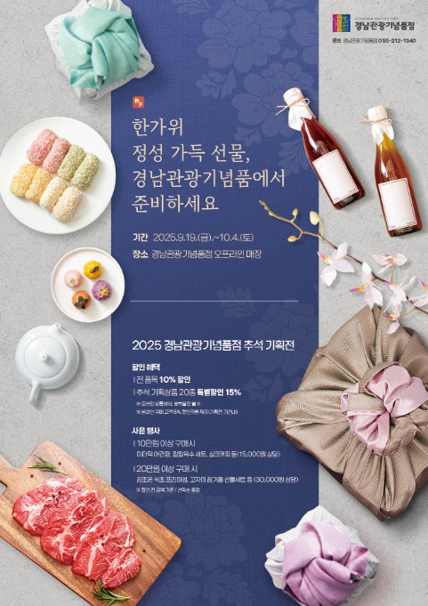 [무한뉴스=최진수 기자] 경상남도는 9월 19일부터 10월 4일까지 경남관광재단 주관으로 추석 명절을 맞이하여 경남 대표 특산물을 합리적인 가격에 만날 수 있는 '경남관광기념품점 추석 기획전'을 개최한다고 밝혔다.