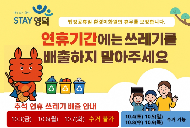 김신규 환경위생과장은 “추석 당일 전에 생활 쓰레기를 미리 배출하고, 추석 연휴 동안에는 다음날인 7일 저녁부터 쓰레기를 배출해 달라”라고 당부했다.