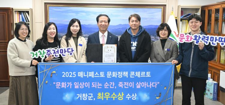 [무한뉴스=최진수 기자] 거창군은 강원특별자치도 원주시 상지대학교에서 개최한 ‘2025 전국 기초단체장 매니페스토 문화정책 콘체르토(Concerto)’ 대회에서 문화기반 도시활력분야 ‘최우수상’을 수상했다고 26일 밝혔다.