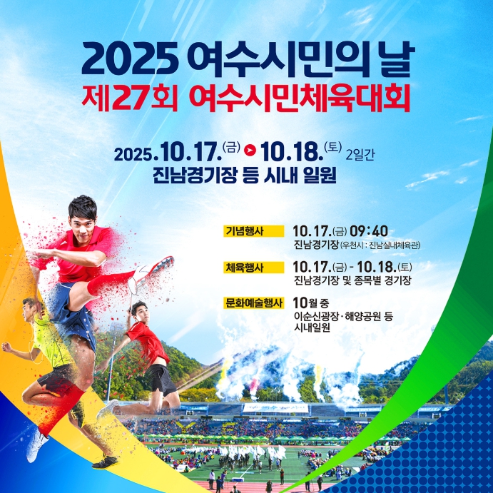 [무한뉴스=정민정 기자] 여수시는 오는 10월 17일(금)부터 18일(토)까지 이틀간 진남경기장 일원에서 ‘2025 여수시민의 날’ 기념행사를 개최한다.