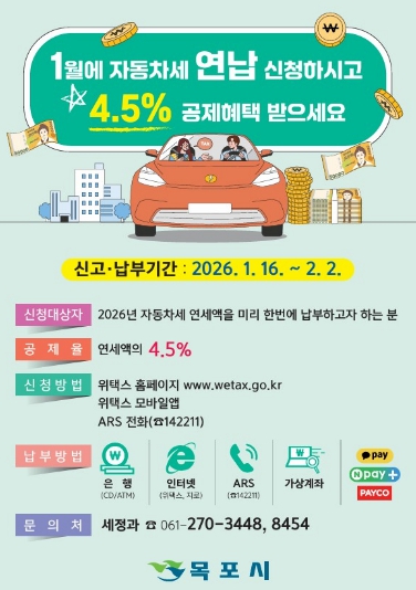 [무한뉴스=정민정 기자] 목포시는 1년치 자동차세를 1월에 미리 납부하면 세액 공제 혜택을 받을 수 있는 ‘자동차세 연납제도’를 한 달간 운영한다고 밝혔다.