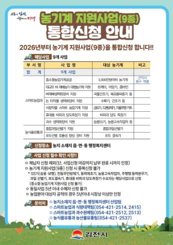 [무한뉴스=최진수 기자] 김천시는 지역 농업인을 대상으로 ‘2026년 농기계 지원사업(9종)’ 신청을 오는 2026년 1월 30일(금)까지 농지소재지 읍면동 행정복지센터에서 접수한다고 밝혔다.