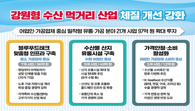 아울러 수산물 소비 기반 확대를 위해 황태, 젓갈, 어포, 조미김 등 K-Seafood 수출기업 육성과 대도시 특판전 개최를 병행하고, 어가 급락이나 일시다획 발생 시에는 수매비 일부를 지원해 시장 충격을 완화하는 등 가격 안정 장치도 강화한다.
