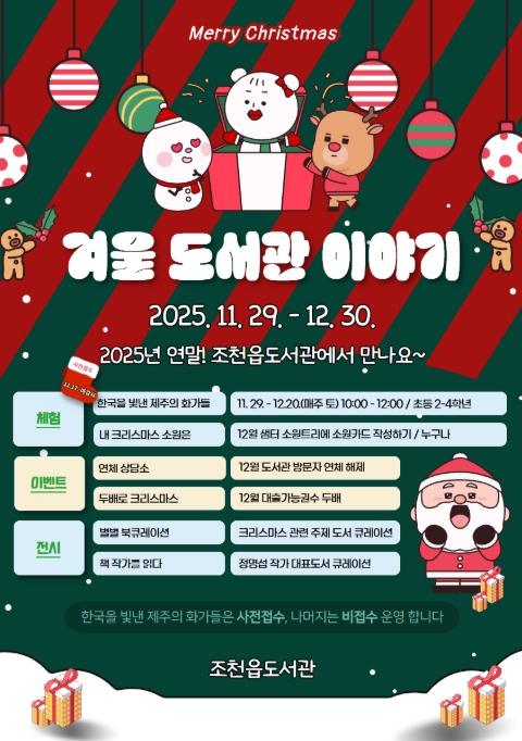 [무한뉴스=정민정 기자] 제주시 조천읍도서관은 지역 주민에게 따뜻한 겨울의 추억을 선사하기 위해 11월 29일부터 12월 30일까지 송년 특별 프로그램 ‘겨울 도서관 이야기’를 운영한다.
