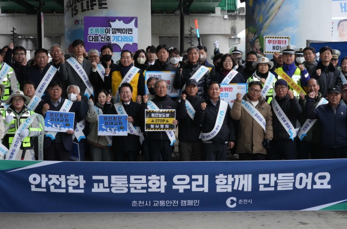 춘천시(시장 육동한)는 26일 출근 시간대 온의교차로에서 시민들과 함께 교통안전 캠페인을 펼쳤다. 이날 캠페인에는 육동한 시장과 춘천경찰서, 춘천시민버스, 자율방범연합대, 개인택시조합, 법인택시협의회, 화물자동차운송협회, 한국교통안전공단, 한국도로교통공단, 모범운전자연합회원 등 약 80명이 참여했다. 이들은 ‘횡단보도 일단정지’, ‘보행자 무단횡단 금지’를 알리는 피켓과 안내문을 활용해 시민들에게 교통안전 메시지를 전달했다.