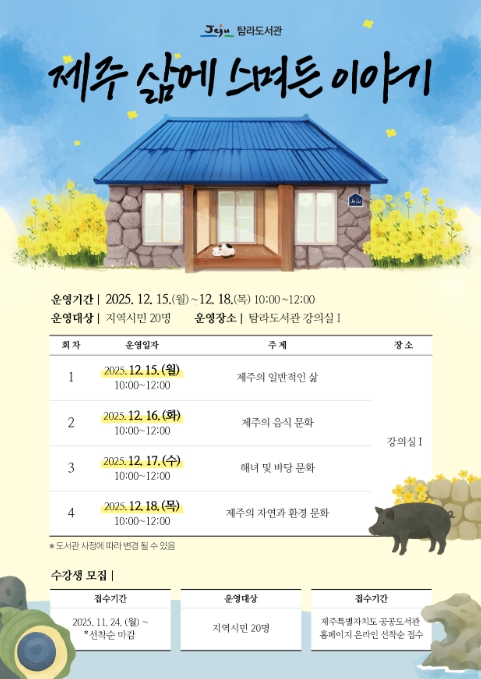 이번 프로그램은 ‘어머니의 루이비통’, ‘바당은 없다’의 저자 송일만 작가가 진행하며, 제주시민 20명을 대상으로 12월 15일부터 18일까지 총 4회에 걸쳐 탐라도서관 강의실에서 진행된다.