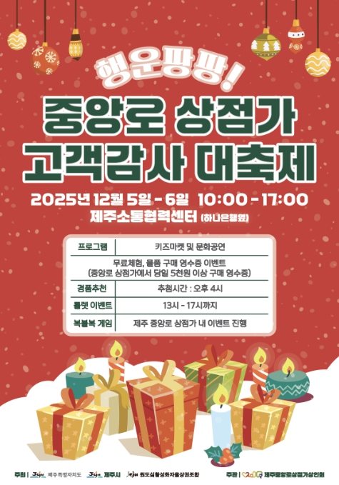 [무한뉴스=정민정 기자] 제주시는 12월 5일과 6일 오전 10시부터 오후 5시까지 중앙로 상점가 일대에서 ‘행운팡팡! 고객감사 대축제’가 개최된다고 밝혔다.