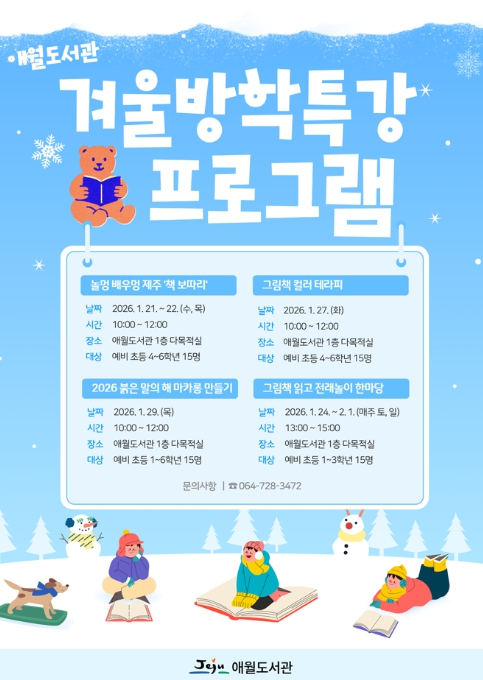 [무한뉴스=정민정 기자] 제주시 애월도서관은 겨울방학을 맞아 어린이들이 책과 놀이, 체험 활동을 통해 즐겁게 배우고 독서에 대한 흥미와 창의력을 키울 수 있도록 ‘2026 애월도서관 겨울방학특강 프로그램’을 운영한다.
