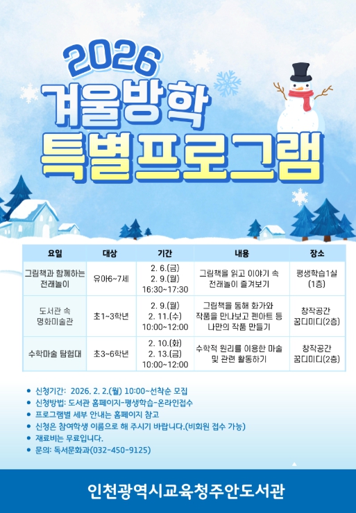 [무한뉴스=정승훈 기자] 인천광역시교육청주안도서관은 관내 유·초등학생에게 다양한 평생학습 기회를 제공하기 위해 2월 6일부터 13일까지 ‘겨울방학 특별프로그램’을 운영한다.