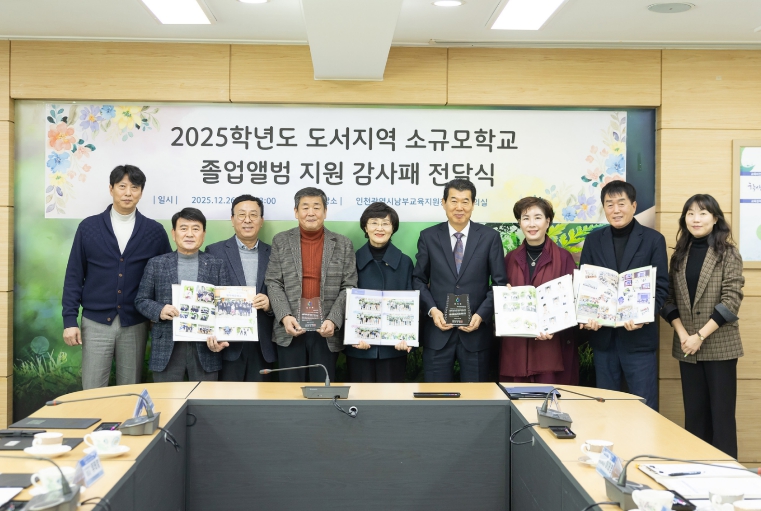 [무한뉴스=정승훈 기자] 인천남부교육지원청은 26일 남부 도서학교 졸업앨범 무료 제작에 협력한 인천사진앨범인쇄협동조합, 푸르미재단, 기호일보와 함께 전수식 및 감사패 전달식을 개최했다.