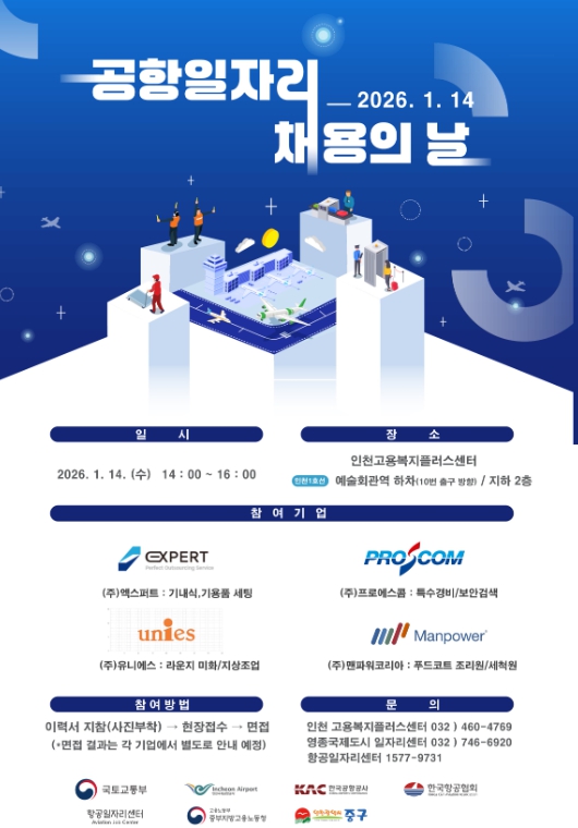 [무한뉴스=정승훈 기자] 인천시 중구는 오는 14일 구월동 소재 인천고용복지플러스센터 지하 2층 채용행사장(남동구 문화로 131)에서 ‘2026년도 제1회 공항일자리 채용의 날’ 행사를 개최한다.