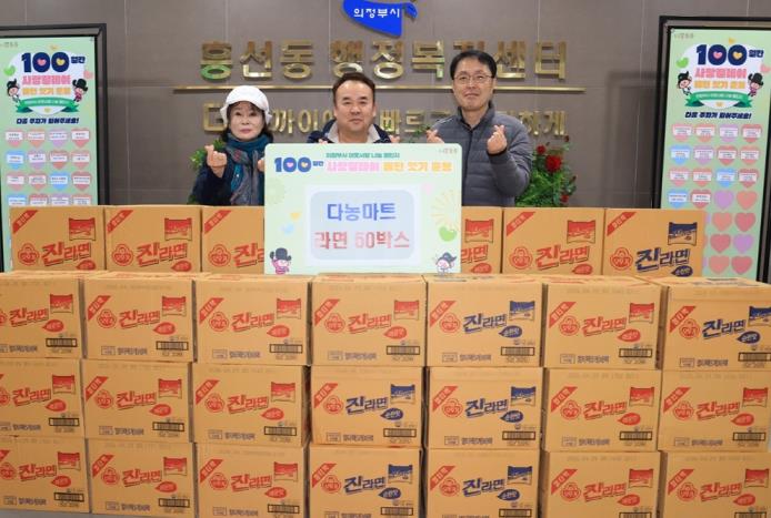 [무한뉴스=정승훈 기자] 의정부시 흥선동행정복지센터는 12월 24일 다농마트가 ‘100일간 사랑릴레이 배턴 잇기’에 동참해 라면 50상자를 기탁했다고 밝혔다.