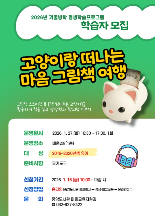 수강료는 무료이며 1월 27일에 운영되며, 참여 신청은 1월 16일 10시부터 중앙도서관 누리집에서 선착순으로 진행된다.