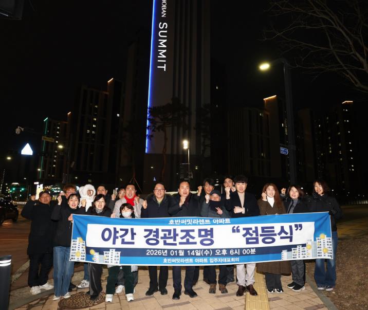 이번 점등식은 기존 옥탑부 조명을 보완해 새롭게 설치한 ‘라인 경관조명’의 본격적인 가동을 알리는 행사로, 아파트 외벽을 따라 조성된 경관조명이 점등되며 단지 전반의 야간 경관이 한층 밝고 쾌적하게 개선됐다.