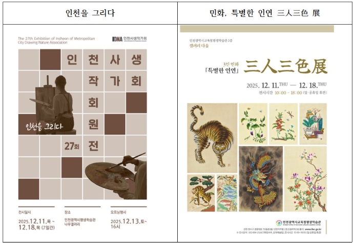 [무한뉴스=정승훈 기자] 인천광역시교육청평생학습관은 12월 11일부터 18일까지 갤러리 나무와 다솜에서 ‘인천을 그리다’와 ‘민화, 특별한 인연 三人三色 展’을 개최한다.