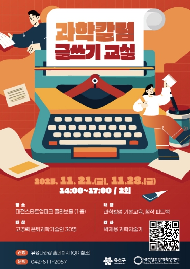 [무한뉴스=정민정 기자] 대전 유성구는 오는 21일과 28일 대전스타트업파크센터에서 고경력 은퇴 과학기술인 대상 ‘과학 칼럼 글쓰기 교실’을 운영한다.
