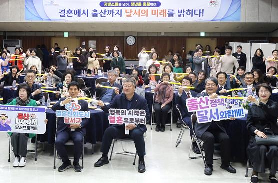 달서구의 결혼장려 사업은 ▷ 결혼인식개선 ▷ 미혼남녀 만남기회 제공 ▷ 결혼장려 인프라구축 ▷ 민·관협력 네트워크 구축으로 청년응원 메시지와 결혼을 통한 가족의 소중한 가치를 확산시켜 미래의 희망을 구현하고자 체계적으로 초저출생 인구위기에 적극 대응하고 있다.
