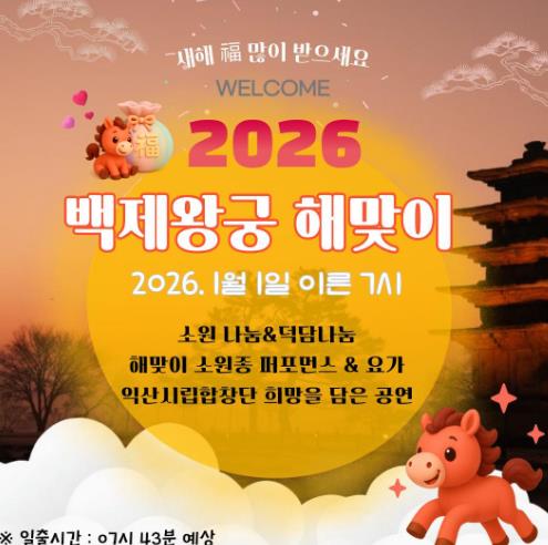 시 관계자는 "천년의 역사를 간직한 백제왕궁에서 맞는 새해 첫 해는 특별한 경험이 될 것"이라며 "2026년 붉은 말의 해를 맞아 모든 시민의 가정에 희망과 행복이 가득하길 바란다"고 말했다.