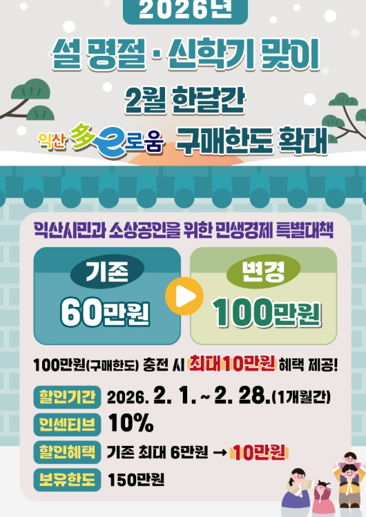 [무한뉴스=정민정 기자] 익산시 대표 효자 정책인 지역사랑상품권 '다이로움'이 2월 한 달 동안 파격적인 혜택으로 시민을 찾아간다.