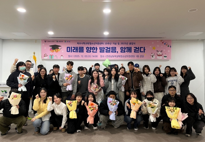 [무한뉴스=정민정 기자] 목포시학교밖청소년지원센터(센터장 박희자)는 개소 10주년을 맞아 지난 12월 3일, 전라남도학교밖청소년지원센터 강당에서 ‘학교 밖 청소년 졸업식’을 개최했다.